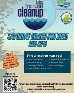 The annual Lake Greenwood Cleanup is scheduled for Saturday, March 8 from 9:00 am until 12:00 pm. Keep Laurens County Beautiful (KLCB) is excited to partner with , Keep Greenwood County Beautiful (KGCB) to host this annual event, blanketing the lake parameters with volunteers, picking up litter. The partnership between Laurens County and Greenwood County is an attempt to beautify the lake community, while inspiring local residents and business owners to get involved.