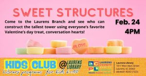 Children 6-10 are invited to the Kids Club at the Laurens Library, February 24th at 4 pm, to build a sweet structure out of conversation hearts. Who can make the tallest tower using only this favorite Valentine’s Day treat? All Kids Club events are free and open to the public.