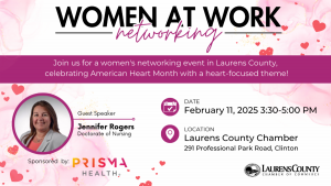 Women at Work events are designed to empower, connect, and inspire women in the community by creating opportunities for professional growth, meaningful networking, and mentorship. Through engaging programs and events, the Laurens County Chamber of Commerce strives to help women reach their full potential while building a strong network of leaders dedicated to driving positive change.